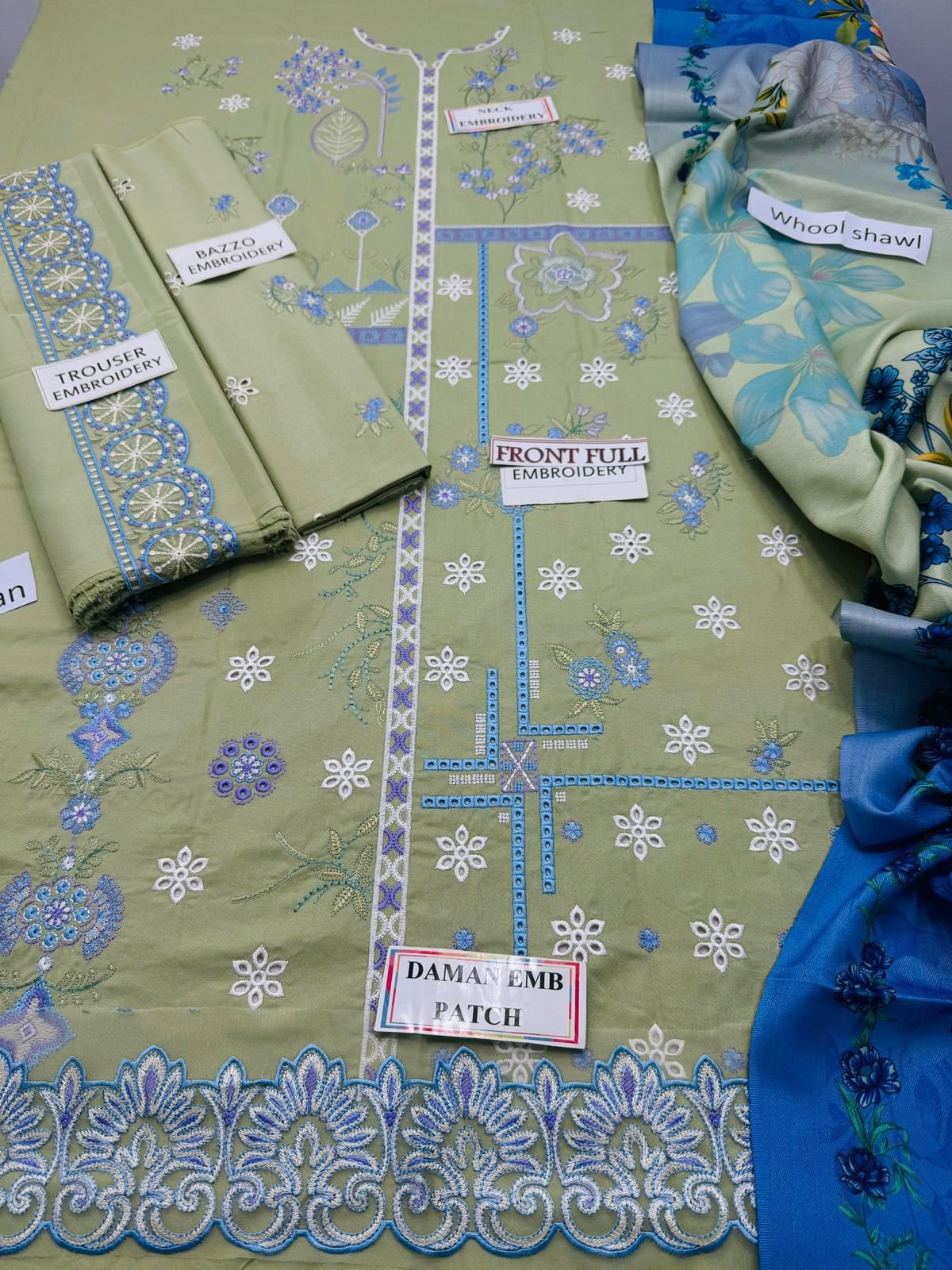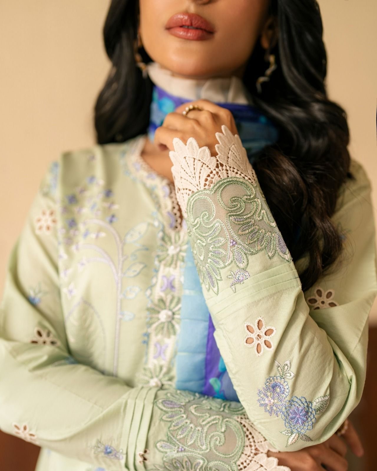 A soft sage-green ensemble accentuated with lilac and blue thread embroidery, finished with delicate lace details on the sleeves and scalloped hemline. The look is uplifted with a digitally printed dupatta in blue hues and paired with a plain trouser for an effortlessly graceful winter style.
