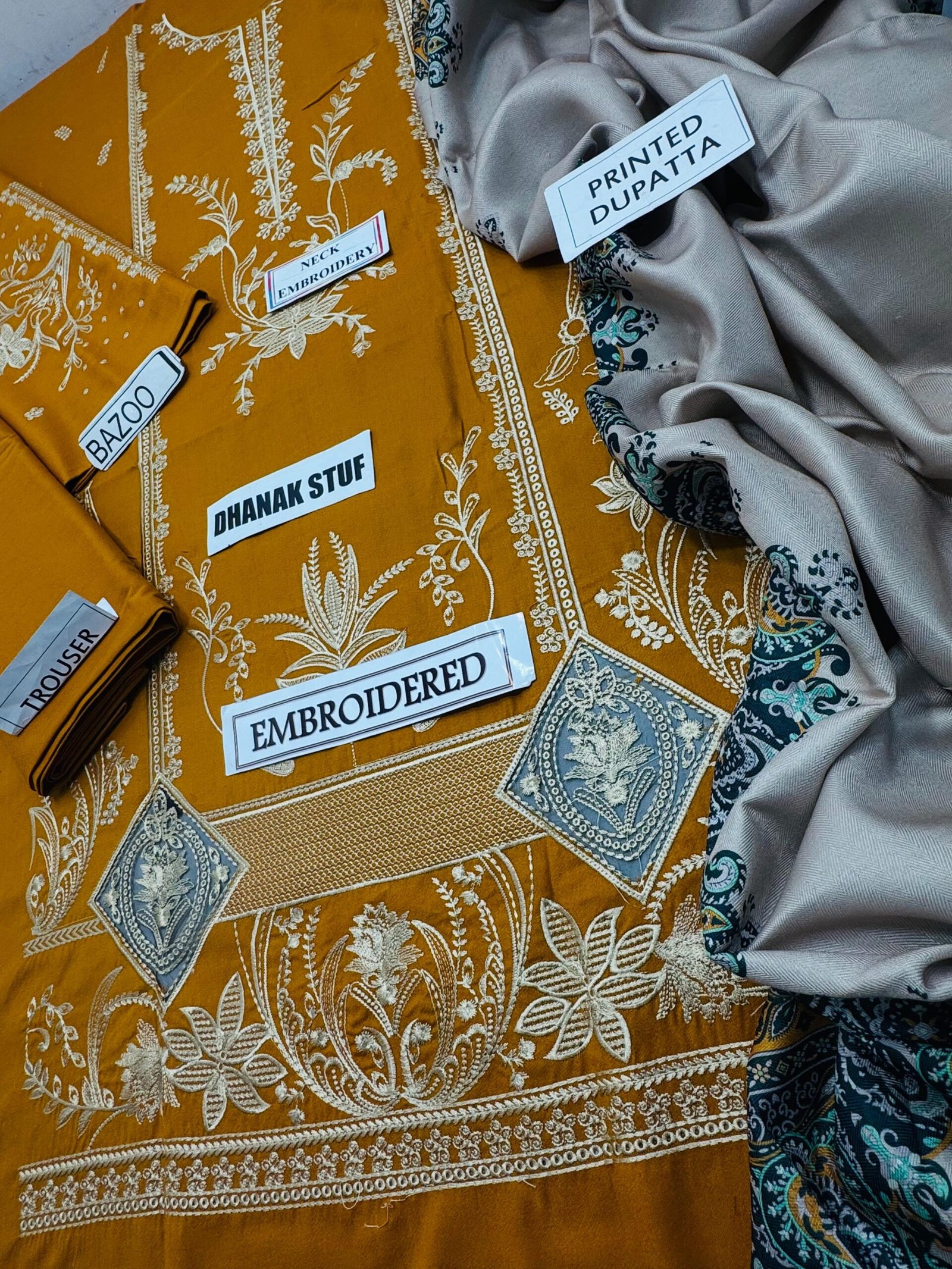 Premium Embroidered Dhanak Shirt (mustard base with silver-grey thread embroidery and artistic motifs)