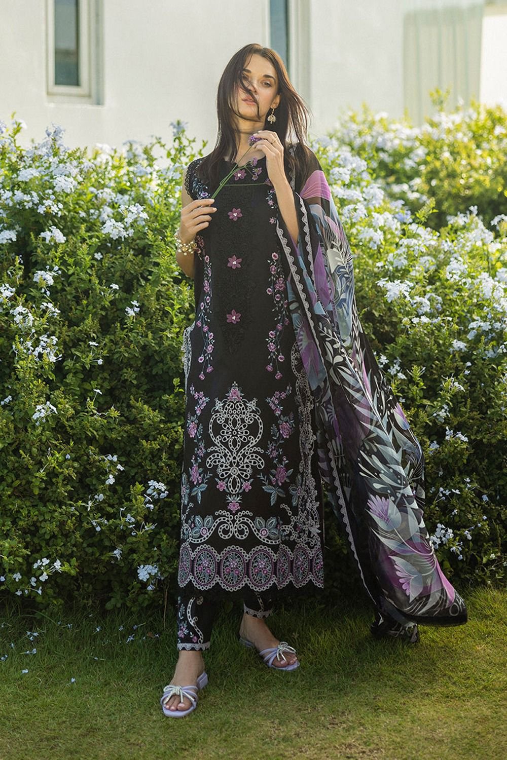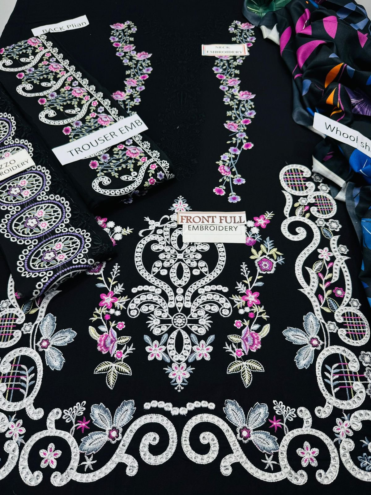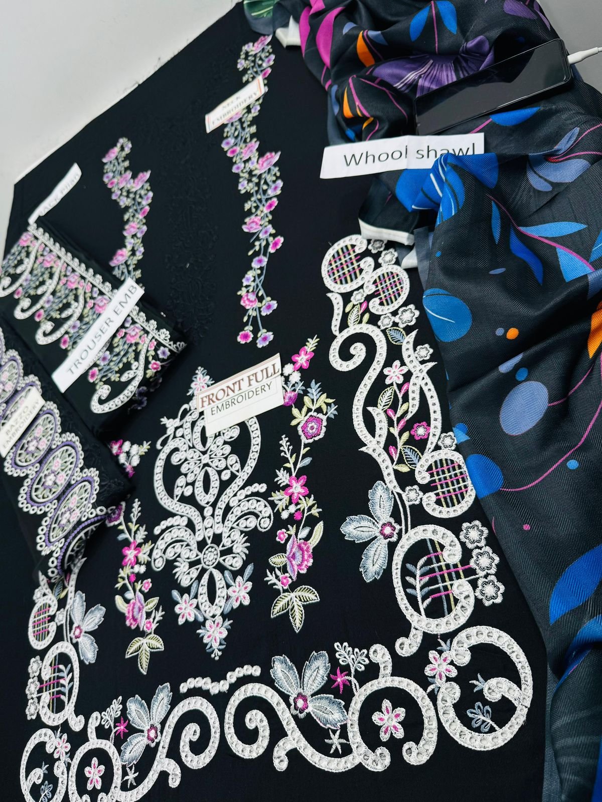 A striking black outfit elevated with intricate white and lilac embroidery, enhanced with delicate floral accents for a graceful charm. The shirt features bold embroidered motifs and a scalloped border that adds richness to the design