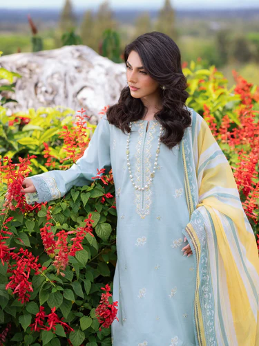The Bluebell Charm from Dhanak’s Winter Collection features a soft blue fabric delicately embroidered with floral motifs and lace-finished sleeves.