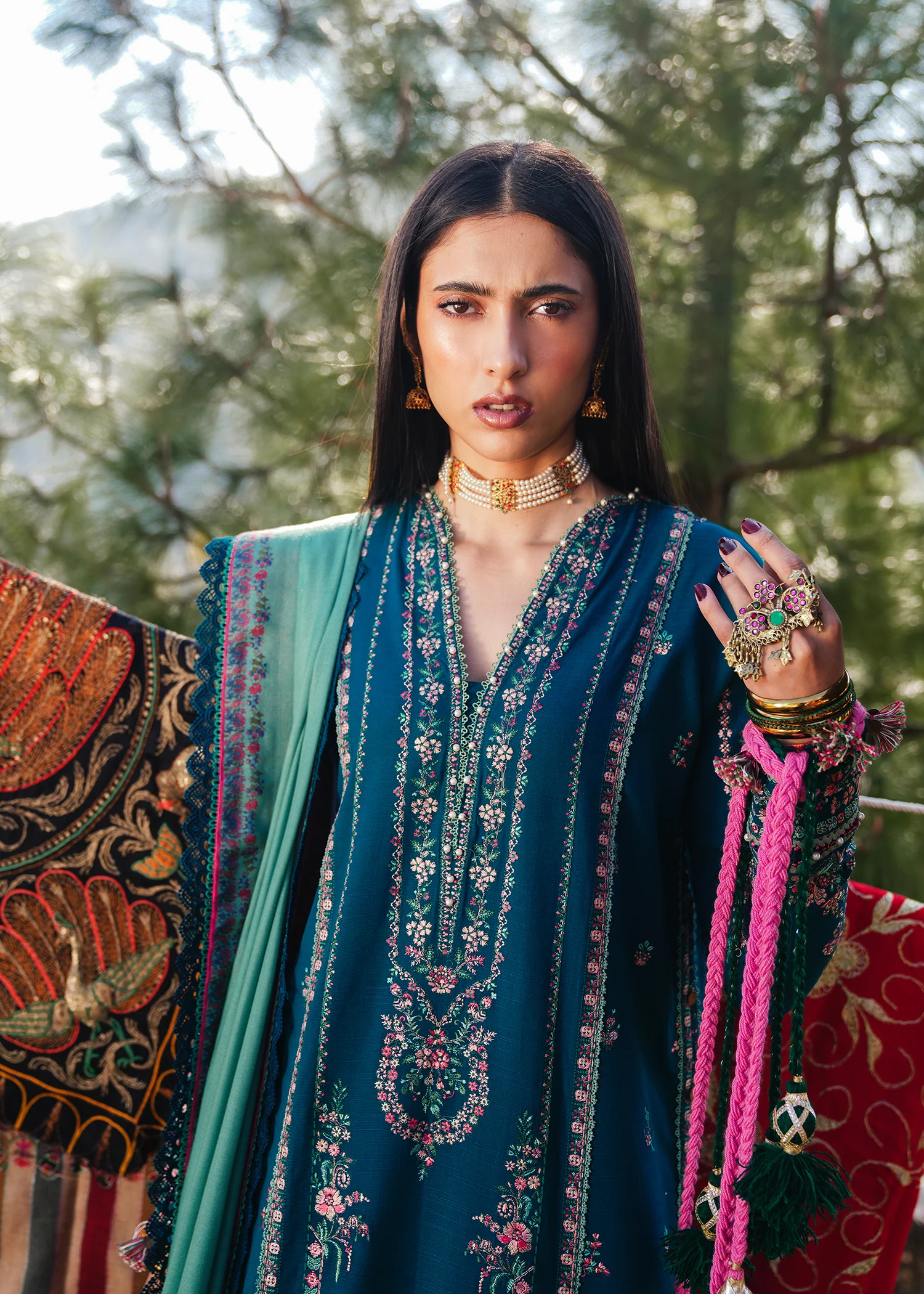 The Teal Majesty from Dhanak’s Winter Collection is crafted on a rich teal base, adorned with detailed floral embroidery in multicolor threads for a regal appeal. Paired with a vibrant Kashmiri wool shawl