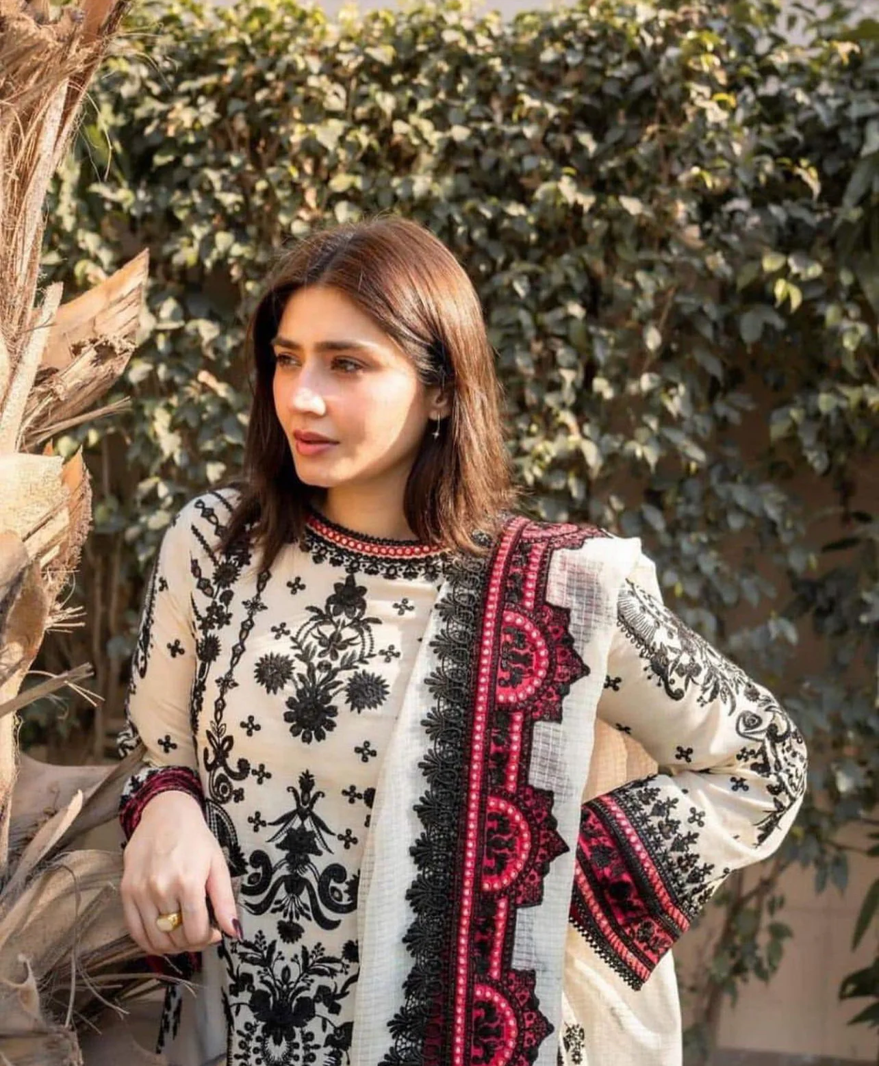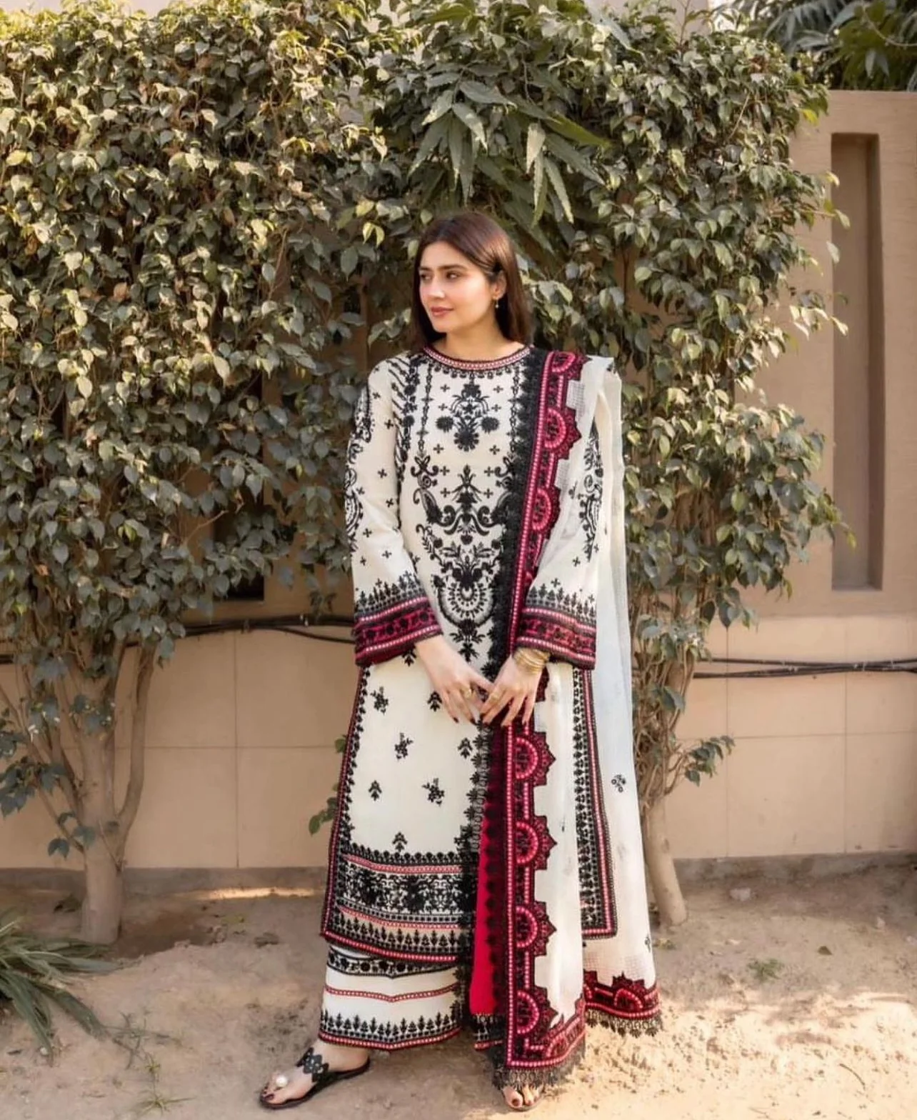 The Mehwar Dress from Dhanak’s Winter Collection is crafted on a pure ivory base, accentuated with striking black thread embroidery and hints of deep maroon detailing. The ensemble radiates timeless charm, paired with a Kashmiri-inspired shawl that adds elegance and warmth.