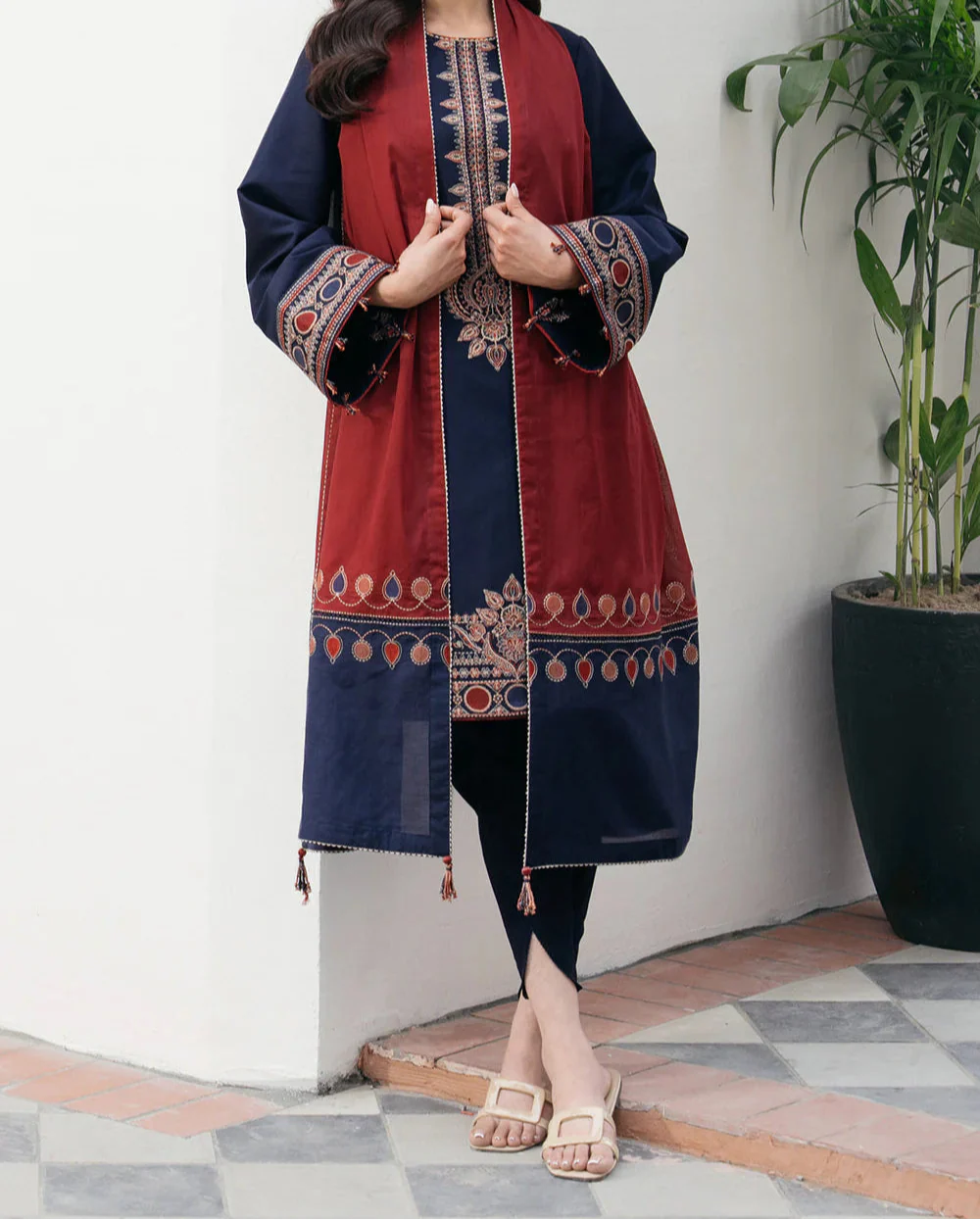 A deep navy blue ensemble featuring intricate thread embroidery in rust and beige tones, highlighted with ornate borders. Paired with a matching embroidered dupatta and tapered trouser for an elegant winter appeal.