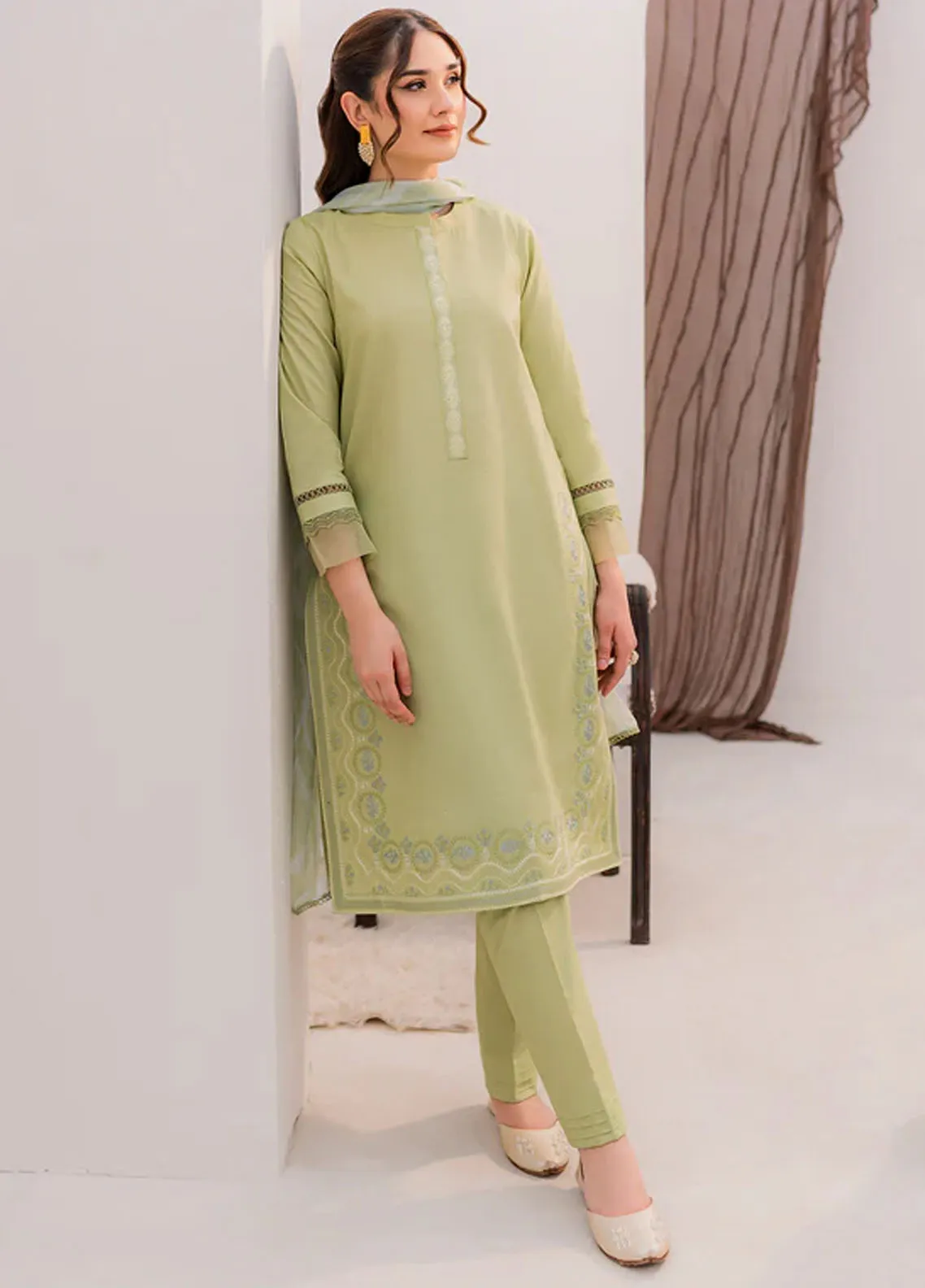 A refreshing mint-green ensemble enhanced with delicate thread embroidery on the neckline, sleeves, and hem. Paired with a soft printed dupatta and plain trouser, this look radiates subtle elegance for winter days.