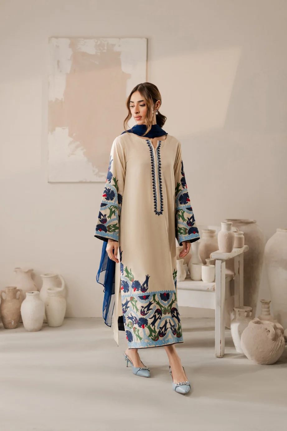 The Sapphire Garden from Dhanak’s Winter Collection features a soft beige base uplifted with striking blue and green embroidery inspired by floral motifs. Paired with a deep navy wool shawl and a plain trouser,