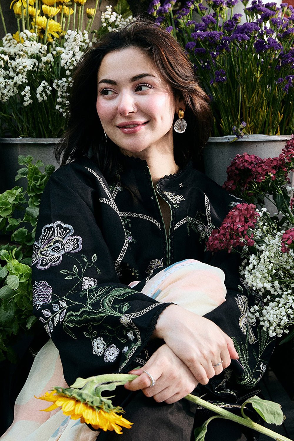 The Tara Noir from Dhanak’s Winter Collection showcases a jet-black base with pastel floral embroidery, paired with a plain trouser and printed shawl for an effortlessly elegant winter look.
