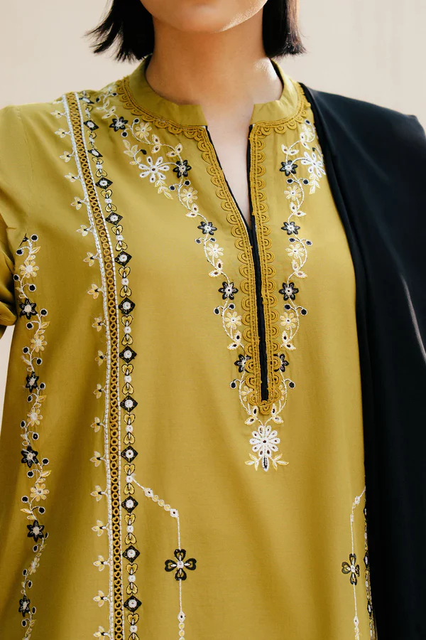 The Olive Charm from Dhanak’s Winter Collection features a warm olive base enhanced with intricate white and black embroidery along the neckline, sleeves, and borders. Paired with a contrasting black wool shawl